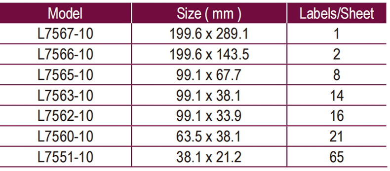 型號 / Size / 每頁標籤數量: