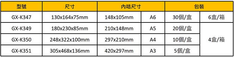 GX-K350橫款 / 248x322x100mm / A4 297x210mm / 個